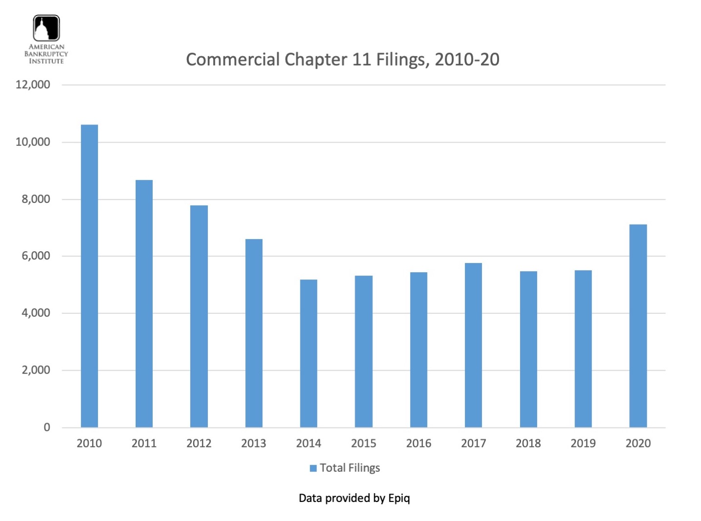 Commercial Chapter 11 Filings, 2010-20 Thursday, January 7, 2021Article Tags: Business ReorganizationCovid19For full statistical charts, please visit the ABI Newsroom.